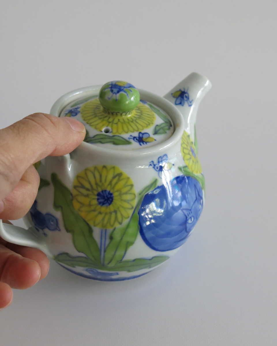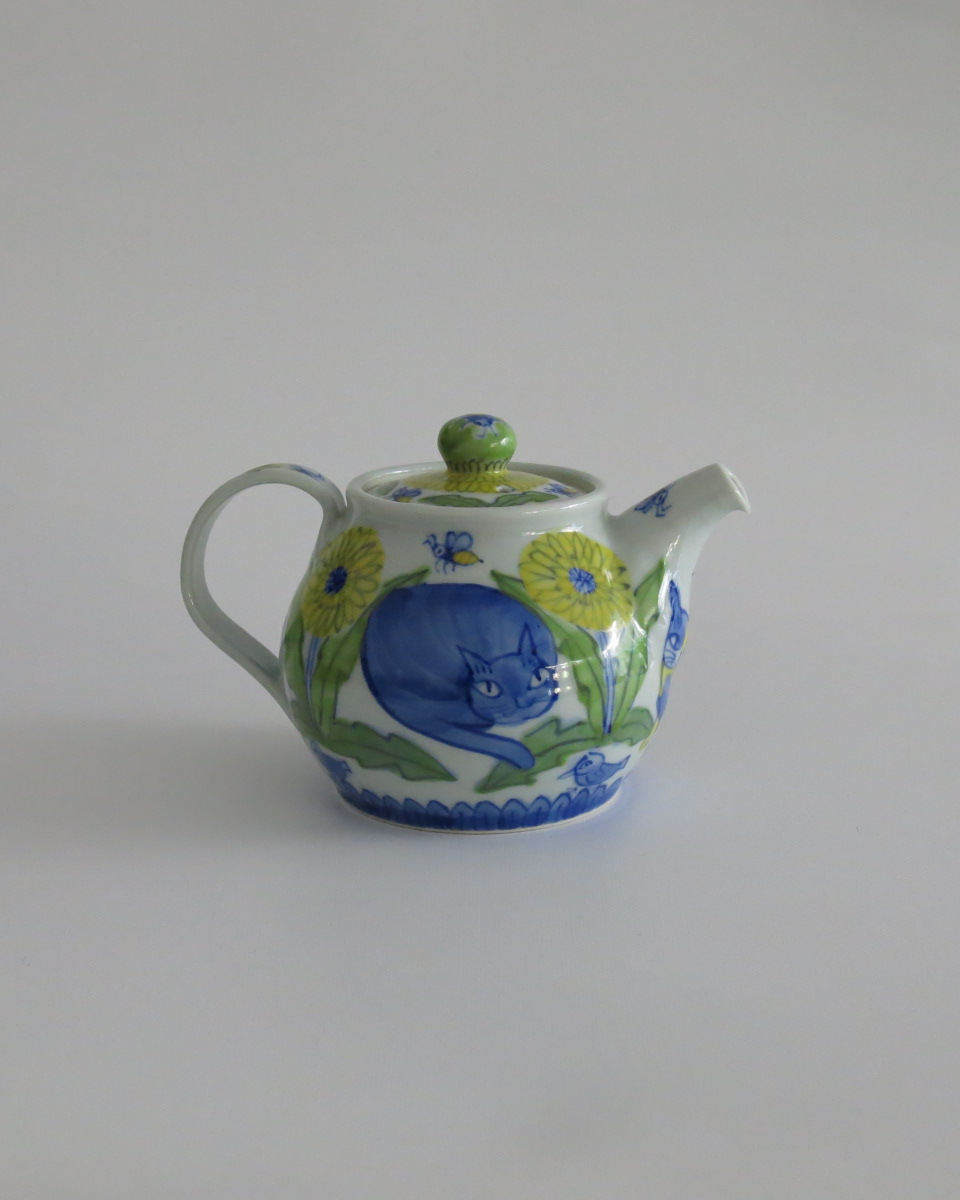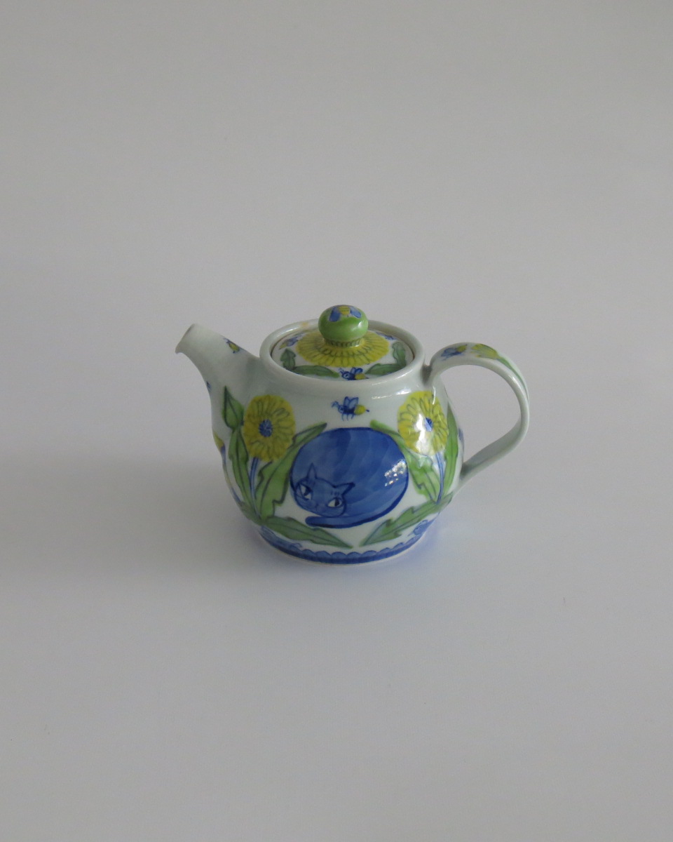 愛らしい猫とたんぽぽのデザインが特徴的なこのポットは、あなたのインテリアに癒しをプラスします。