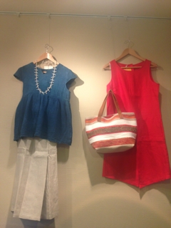 右:きれいな赤のリネンチュニックと